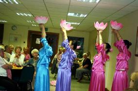 【明慧网2005年10月2日】2005年9月29日,爱尔兰法轮功学员受都柏林格林希尔(Greenhill)区妇女俱乐部的邀请,在格林希尔社区中心(Greenhill Community Centre)表演了优美的莲花舞,展示了法轮功的祥和舒缓的功法、并教妇女俱乐部的女士们如何制作纸莲花。