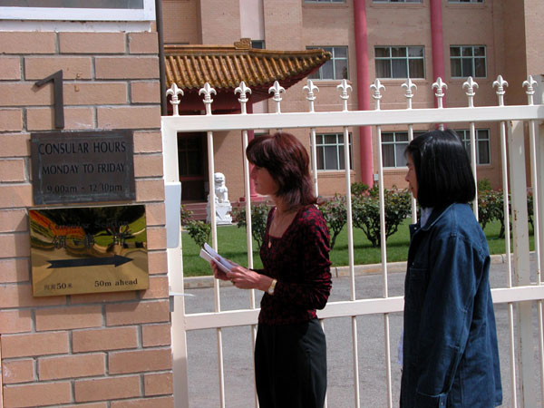 宣读公告后,两名法轮功学员来到中使馆大门前按铃,希望将公告递交给中国驻澳大使,但使馆内无人回答。法轮功学员们希望高墙内的同胞能清楚的知道,天灭中共是历史的必然,神必将清算对大法行恶者。在这种情况下,如果有人不悬崖勒马,继续执行江氏流氓集团的镇压政策,就是罪不容恕,定将受到严惩。