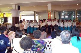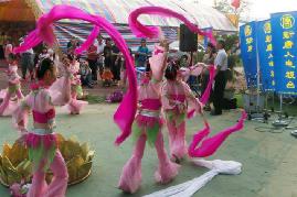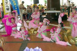 ![]() 法轮大法学员的合唱团表演 | ![]() 神韵艺术舞团的小舞者们在露天演出舞蹈 |