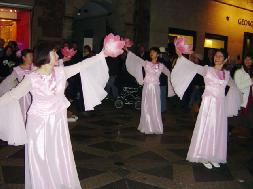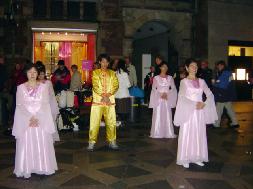 哥本哈根与瑞典马尔默的法轮大法弟子,也来到了欢乐的人群中。美丽的仙女服与金黄色的炼功服相互映衬,一首“法轮大法好”的乐曲,一组柔美的莲花舞,一套宁静的功法表演,给这喧闹的夜晚带来了出世脱俗的祥和。一张法轮大法的真象传单,一朵纸折莲花,把观众的心拉近了大法。