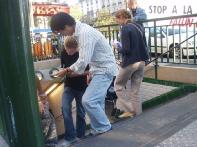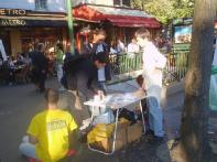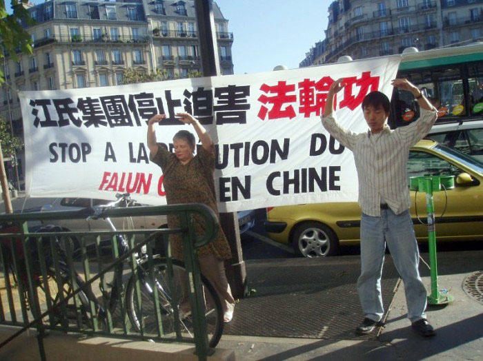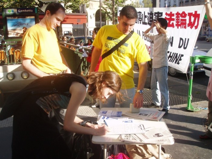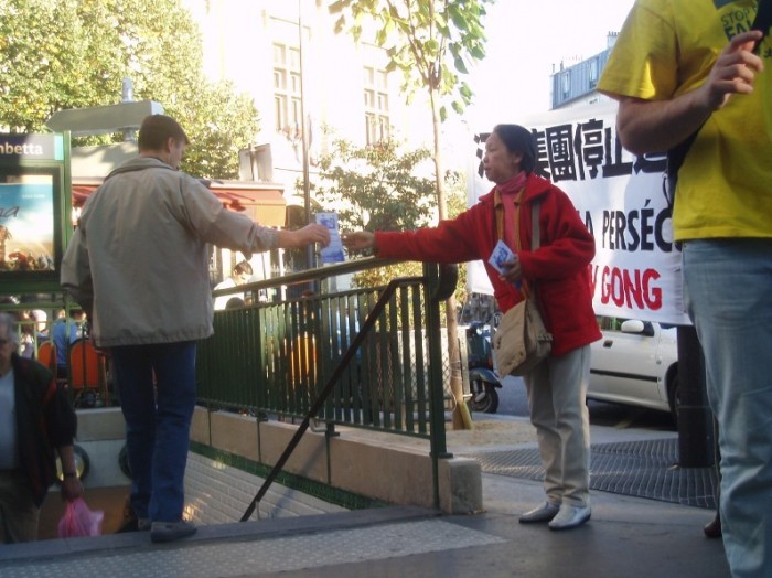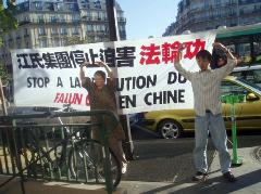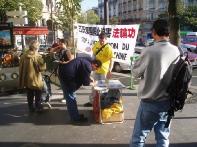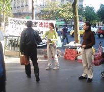 在舒缓祥和的炼功音乐声中,学员们的功法演示吸引了过往的行人驻足观看。一张张载满法轮功真象的传单向人们揭示了中共残酷迫害法轮功学员的事实。在这漫长的6年里,有多少无辜的法轮功学员只因为炼功健身和修心向善而被邪恶中共毫无人性的虐杀,不是妻离子散,就是家破人亡、株连亲友。善良的法国民众在明白了真象后无一不痛斥这场非人的迫害。