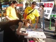一位过路的男士知道了中国正发生着邪恶的迫害后立即签名声援反迫害。他表示这场迫害太骇人听闻了。他说:“本来打算去中国度假,现在我不去了。”的确,没人会有兴致到一个没有基本人权、好人长期遭受残酷迫害的国家去旅游。