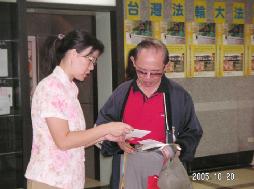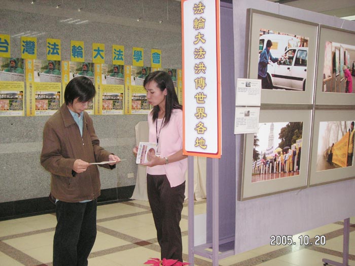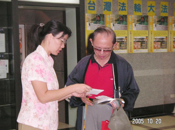 一位年轻的女孩子询问了许多关于法轮大法如何修炼的问题,她虽然年纪轻轻但十分重视健康问题,也一直在寻找修炼法门,经过学员的仔细说明,她开心的拿了资料,并说要买《转法轮》好好研读,而且就在她家附近的阳明公园就有一个炼功点呢。