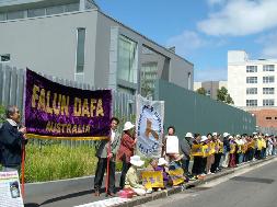 ![]() 近百名悉尼法轮功学员聚集中领馆前呼吁停止迫害 | ![]() 纽省法轮佛学会代表宣读中英文公告 |