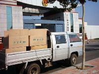下图中显示一辆满载奴工原料的货车停在辽宁省女子监狱门前,货箱上注有“金天宇”磁振系列健康用品标识,厂家为沈阳逸生健康用品开发公司(沈阳市和平区三好街79号,电话:22948660 22947708 邮编:110004)。