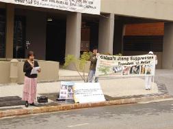 活动刚开始不久,正当一名学员郑重宣读公告时,突然从中共领馆所在大楼的楼顶里喷出一股水流,直喷向在场的学员,学员的衣服都被淋湿。然而在场的学员均不为所动,继续宣读公告。
