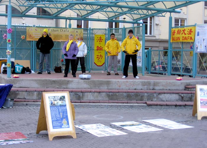 当天奥鲁的气温已到零下,行人也已着冬装。上午十点学员就赶到露天现场,没人指挥,但又好似早有安排。学员们默契配合,有条不紊,很快布置好现场,又各自恰到好处的选择了洪法的位置,就这样顶着寒风,怀着善心,向奥鲁人民展示法轮大法的美好,讲诉中共恶党六年来对修炼真善忍的大法弟子的残酷迫害,呼吁人们一起来制止这场迫害。