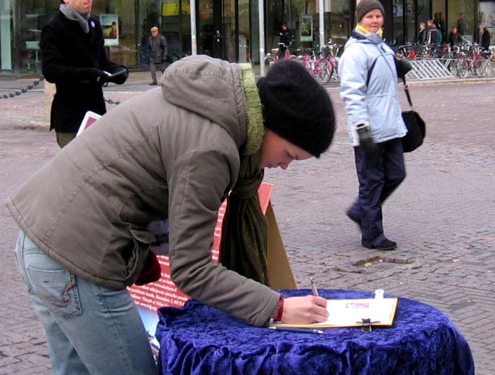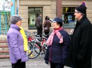 几个年轻女学生到来时,学员不仅给她们递上真象资料,还送她们每人一朵美丽的纸叠莲花,同时讲述小法度的故事:法度不满一岁时,爸爸因修炼法轮功,在中国被邪恶共党及帮凶迫害致死,听到噩耗,妈妈带着小法度赶往中国,欲见其爸爸最后一面;但是结果只见到了骨灰;之后,小小年纪的法度和妈妈走遍世界上三十多个国家,向人们讲述法轮功的真实故事,揭露江××和中共勾结残酷迫害法轮功;同时呼吁世人共同来制止这场迫害并将象征纯洁美好的莲花带给世界各国人民。女孩们非常认真的听着,离开时向学员表示了深深的谢意。