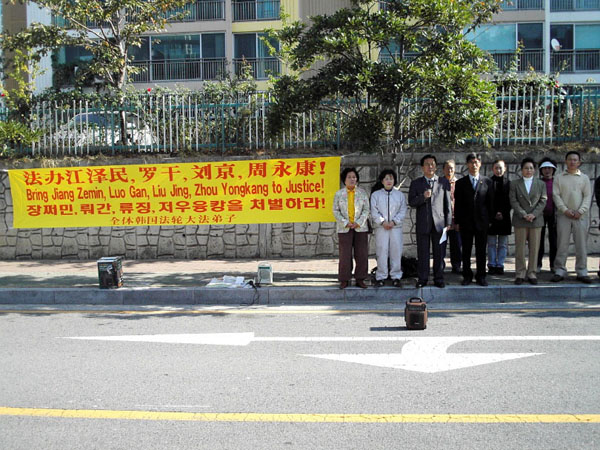 当天出席活动的法轮功学员表示:“自1999年以来,中共一直在镇压法轮功,到2005年,已有至少2700余名学员被迫害致死。”学员们呼吁“惩办江泽民和其追随者罗干、周永康、刘京等人,制止对法轮功学员的迫害” 。最后学员们向驻韩国釜山中国领事馆递送了“法轮大法学会公告”。