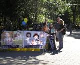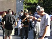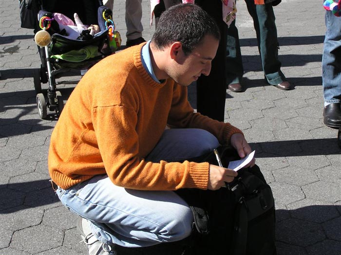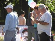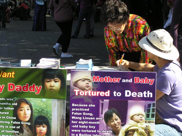 义演活动的舞台边,挂着小女孩法度为模型创造作的特大张贴画——“我不知道为什么我的爸爸不在了”。画中的小法度拿着纪念爸爸的花圈,神情困惑,令人悲伤。游人们很愿意接过法轮功学员递上的真象传单,仔细的阅读,也很愿意为营救孤儿的明信片签名。