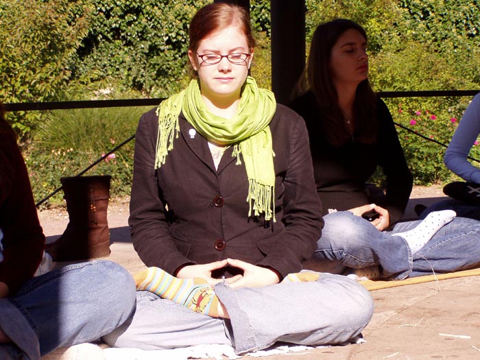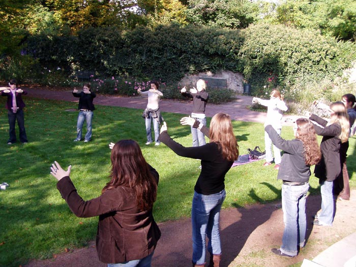 接着又给他们放了师父教功的录像,让他们跟着一起学。有些同学学的很快,动作做得很好。之后我们一起到学校附近的公园里和着音乐炼五套功法。有的同学跟我说他们炼功时能感觉到能量而且觉得很舒服。我们炼功时有一位女士一直观察我们,等炼完后跟我讲,觉得这功法很和谐,表示也愿意参加,还问我们什么时候再来。