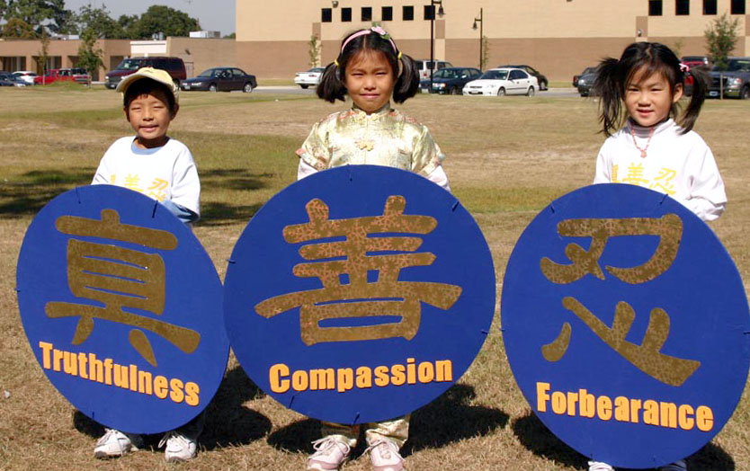 明慧学校的部份小弟子拿着“真、善、忍”匾牌
