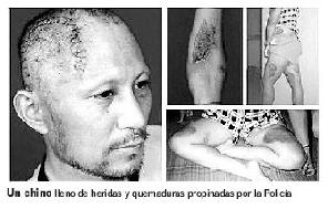 ![]() 中共警察对法轮功学员施行殴打 | ![]() 一个法轮功学员,在遭到中共警察的酷刑后满身的伤口和烧伤 |