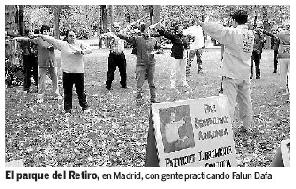 ![]() 在法轮功被江××禁止之前,成百上千的中国人在公园里自由炼功 | ![]() 马德里的蒂乐公园(porque del retiro),在安静、祥和中炼法轮功的人们 |
