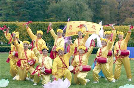 ![]() 令人振奋的腰鼓表演,没人能想到在最前排的表演者陈先生,曾在中国因坚持修炼法轮功,被非法关押、和酷刑折磨了18个月。 | ![]() 人们在法轮功信息展位前了解真象 |