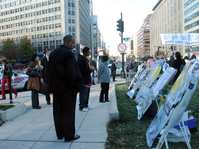 地处白宫附近的Farragut Square是一个街心花园广场,附近都是各大媒体、联邦政府机构、华府智库的办公大楼,集会正值午休时间,周围的行人如潮,不少人停下来驻足观看法轮功学员在集会现场的反酷刑展,聆听集会发言。