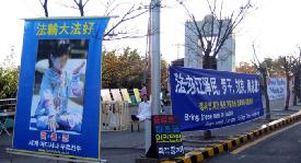 法轮功学员表示,在APEC会议期间他们会继续留在釜山讲真象,呼吁制止中共对法轮功的迫害。