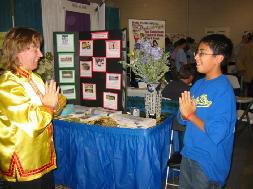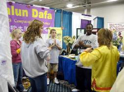 【明慧网2005年11月14日】2005年11月3至6日,美国印第安纳波斯市举办了一年一度的展现印城多元文化的国际文化节。为期四天的集教育,娱乐,饮食为一体的丰富多彩的活动吸引了成千上万的民众前来领略异国风采,学习不同民族的文化习俗。一些中小学校还组织了全校师生前来参观。完美体现中国传统文化的法轮大法的展位前自然吸引了众多对东方文化好奇和神往的人们,其中包括许多天真烂漫的孩子。他们中很多是第一次听说并体验东方神秘的打坐冥想。“法轮大法”,“真善忍” 也如种子一样埋入他们的心田,带给他们美好的未来。