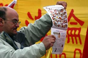 ![]() 法办江、罗、刘、周(横幅后正好是中共收买的“欢迎团”) |