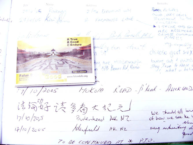 ![]() 老人在留言签名簿留下“法轮功好,请多看大纪元”的签字 |