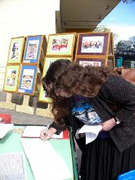 照片上的洋人女士听到法轮功学员讲述在中国大陆共产邪党耗费巨资迫害法轮功学员已6年了。她在留言签名簿中写下:这么残忍!为什么还要和中国共产党政府贸易啊!?