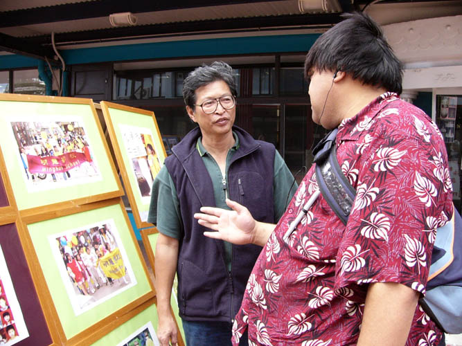 有一对华人老年夫妇,看过所有摄影图片后,还在“法轮大法好”的横幅前摄影留念。学员请他们坐下休息时,他们主动介绍自己是中国河南地区的人,已八、九十岁了。他们知道法轮功好。