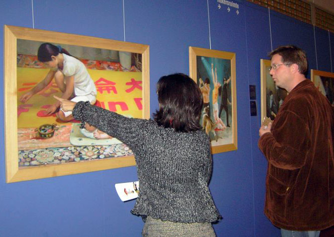 画展中有一幅作品是关于法轮功学员制作横幅的场景。讲解员告诉观众,在中国大陆,出去挂一个横幅,发一张传单,就面临被酷刑迫害的危险。有参观者问,为什么要这样做呢?为什么不待在家里呢?讲解员表示,法轮功学员要这样做,因为他们不忍心看着监狱里的同修被折磨致死,不忍心看着广大民众被中共谎言蒙蔽,他们走出来的目地是为了减轻迫害,制止迫害。观众的眼里流露出了钦佩的目光。