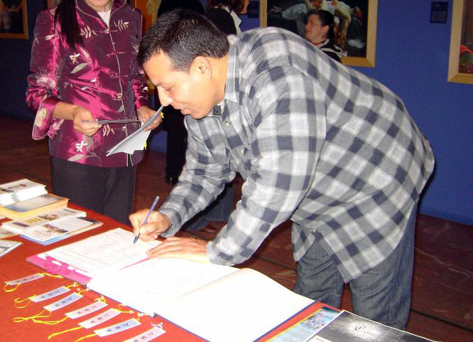 看完画展的人们表情肃穆,心情沉重。当法轮功学员询问他们是否愿意签名声援起诉迫害法轮功元凶江××的诉讼案,帮助制止迫害时,很多人都毫不犹豫的签下了名字。