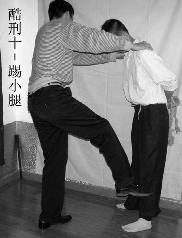 ②受刑者蹲或坐,施刑者猛踹受刑者心口处,致使受刑者呼吸困难,两眼发黑,嗓子发甜,呕吐,心口青紫。