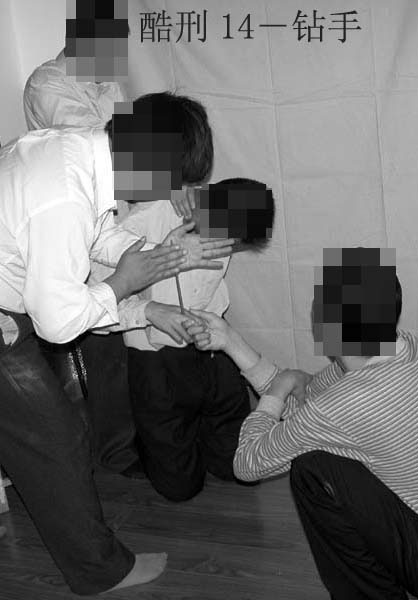 9. “蹲姿铐”:双手朝后铐住,挂在墙或高低床的某处,受刑者站不起也蹲不下,腰腿手臂酸痛。