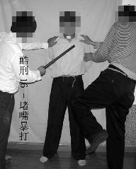 13. “跨板凳”:大法学员两脚间放2个或3个小凳子长时间站立,双腿筋肌肉酸痛。