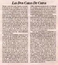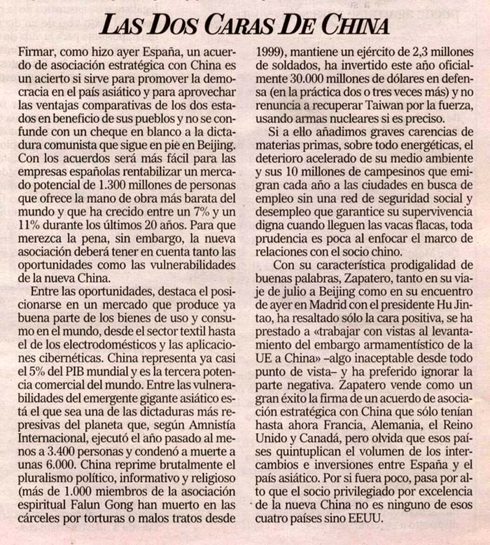 文章说,昨天西班牙同中国(中共)签署了战略伙伴关系,如果这样可以帮助这个伟大的亚洲国家步入民主体制的话那就最好了,但我们明白这又是一张北京共产独裁政权开给我们的空头支票。有了这个签约,西班牙公司可以更加容易的在这个拥有13亿人口的市场里投资。然而,如果我们想真正的受益于这个战略伙伴,我们就一定要认清这个双面中国,它的机遇和陷阱。