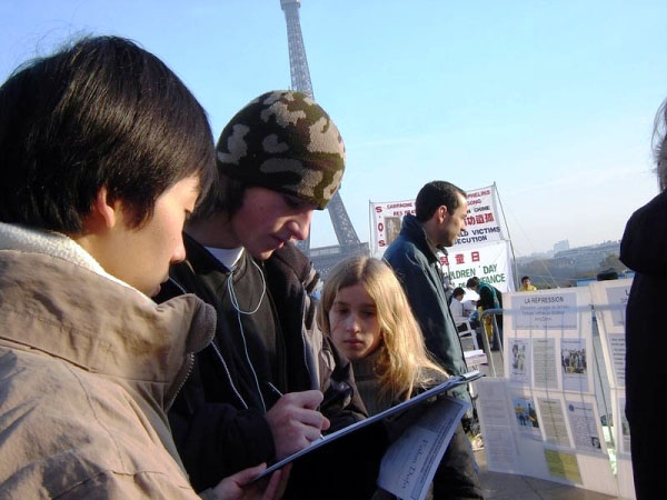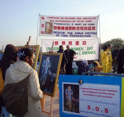 然而,并不是世界上每一个地方的孩子们都如此的幸运。在地球另一端的中国,由于邪恶中共对法轮功学员的非法迫害,不知有多少无辜的儿童失去了父母亲人,流离失所,甚至在这场灭绝人性的迫害中被夺去了幼小的生命。救救孩子们!呼吁营救在中国受迫害法轮功儿童的活动在此时的巴黎人权广场上吸引了众多游人的关注。