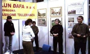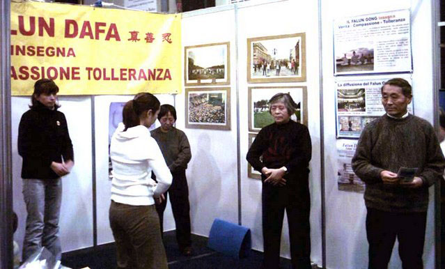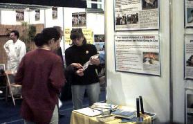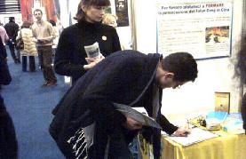 很多人都同展台上的学员交谈,他们在呼吁停止迫害的信上签上他们的名字。邻近展台的人也非常友好,纷纷来了解情况,签名呼吁停止迫害,还学习折叠纸莲花。其中一位先生,在认真读了展板之后,又停下来和学员交谈了很长时间,他表示非常希望能够为尽早停止迫害做些事情。学员讲述了这六年里中国法轮大法弟子面对迫害不屈的勇气、为了让宝贵的中国人民知道真象、了解中共邪恶的迫害手段所做的一切,以及海外大法弟子为讲清真象付出的努力,这位先生感动得眼睛湿润了。