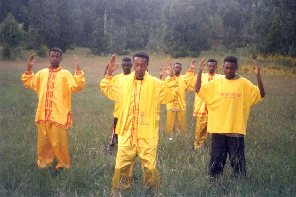 ,越来越多的人开始修炼法轮功。这里展示的是埃塞俄比亚阿帝斯阿贝巴市(Addis Abeba)炼功小组集体学法,炼功和讲真象的情形。