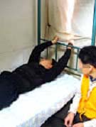 此种酷刑即是将学员扣在铁床边横棱上,腰和臂部硬塞至床下。遭受此刑者非常痛苦,严重者腰部受伤,不能直立。