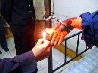 此种酷刑即是将人两臂抻至极限铐在单人床的两侧床柱上,身体呈”大”字形,由恶警四防员暴打,用脚踢小腹、前脑、软肋、脸、嘴,用椅子砸头,被打严重者牙脱落,耳膜穿孔,或用打火机烧手指,把手指烧焦烧黑,变形。大法学员贾精文在受此刑时曾手铐被抻折,大法学员李忠杰、左中右在受此酷刑时被四防郭伟宾、马九庆、沈闯、焦志华、安庆中暴打一个多小时,五脏被打得疼痛无法描诉,大法弟子李忠杰的嘴被踢得很长时间合不拢。