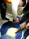 此种酷刑是锦州教养院经常使用的一种强行“转化”法轮功学员的酷刑。它们是首先用站刑,几天几宿不让学员睡觉,再与此刑相配合。把学员用手铐背扣上,再用绳子把学员双腿双盘起来绑上,用脚踩。然后再把上身和下身压成一个平面,仰面推倒在地,由三个恶警和一个四防员用电棍专电学员的脚心、后心、心口窝等处。另外两个恶人用手拧学员脑袋并毒打,然后将学员拧过来,翻过去、任由恶警用电棍专往敏感处电。受此刑的人,数月不能行走。