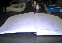 画展即将结束了,一位年轻的女士匆匆的赶来,径直走到留言簿前表示要留言。只见她从口袋里拿出了一张纸条又仔细的看了一眼,然后开始认真的写了起来。终于写完后她告诉学员,她早就看过了画展,非常感慨,所以最后决定再在留言本上写下她的心里话,她还补充说,这场迫害不应该再持续下去了,应该立即停止。