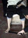 (1)这是一种残忍的体罚。大法学员被迫坐在一尺见方的小木凳上,双腿间距不准超过10公分,双手放在双膝上,身子坐直,不准闭眼,就这一个姿势,不准动。周围有“四防”犯人看着,谁动打谁。坐在前排的学员被迫戴上安全帽,上背铐,以防止学员支撑不住撞暖气或撞墙。做时间长了,腰腿剧痛,臀部的肉都变成青紫色,刺痛难忍,甚至腐烂。每天最长的体罚时间要达16小时左右。有的一坐长达三年之久。