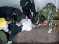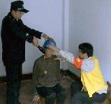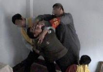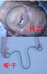(2)此种酷刑又叫(勒嘴)是恶警闫国生设计出的这种刑具。为了防止大法学员说话,恶人将大法学员上背铐,铐在凳子上,使人不能动,再用毛巾把嘴勒上,“四防”在一边看着,不让动。
