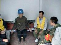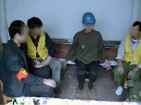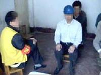 (3)让学员坐小凳,头戴安全帽,双手铐在铁床上,由四防看着,不许动弹。
