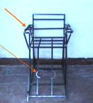 图示是法轮功学员仿制的。教养院体罚学员用的铁椅子模型,实际的铁椅子比模型要厚重得多,需由几个人才能抬动。