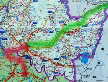 (松花江流域被污染的地区,红色表示已被污染的区域,而绿色表示污染流将流经的区域。)