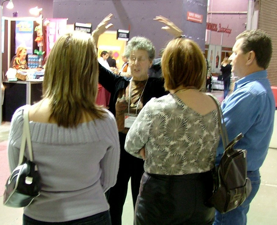 两天的博览会很快就要结束了,其它展位的人主动的相继过来了解真象、拿资料。隔壁展位的摊主不时的过来拿资料送给她的顾客。人们珍惜着分分秒秒的时间。有的人正在和法轮功学员说话,看到电视播放法轮功创始人的教功录像时,马上奔到电视机前学起动作来。