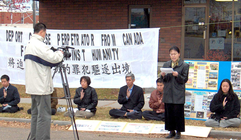 2005年11月1日,加拿大亚伯塔省法轮大法学员,在副总理和联邦安全部长安妮•麦柯里兰在埃德蒙德市的办公室门前,召开新闻发布会,通报了正在加拿大访问的中共吉林省委副书记林炎志,因积极参与迫害法轮功,于2005年10月28日在多伦多被起诉的情况。
