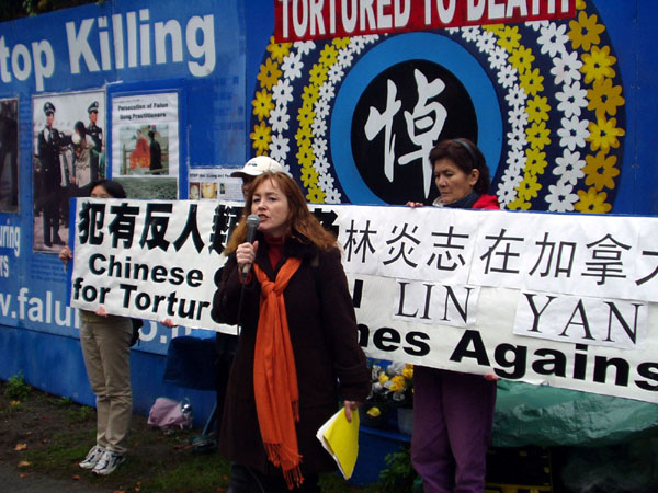 法轮功学员陈女士介绍了,林炎志在吉林省直接参与对法轮功学员的迫害,和其迫害法轮功中令人发指的言行;并呼吁加拿大政府和警方按照“加拿大反人类和战争罪方案”(Canada's Crimes Against Humanity and War Crimes Program),就林的罪行立即展开调查,缉拿并驱逐林炎志。