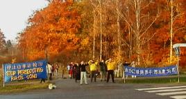 在宣读《公告》前后,学员们展示了5套功法,来往行人不时停留观看,索要法轮功真象资料,听学员讲述真象。