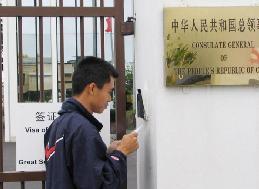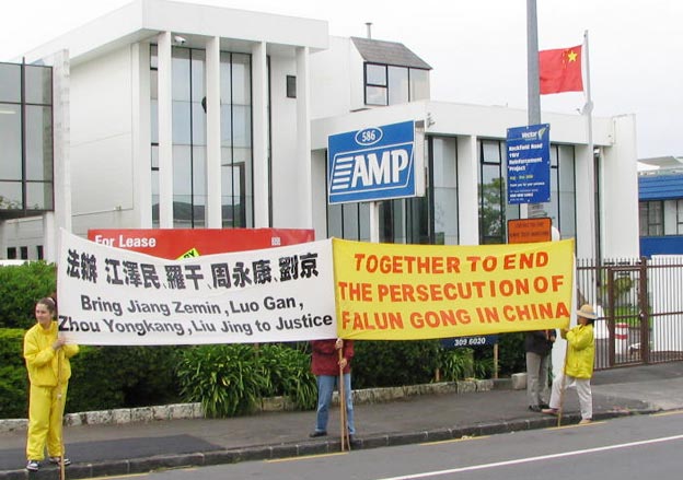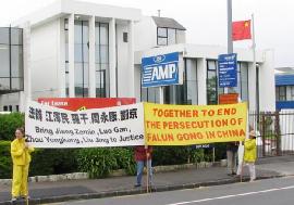 中国驻奥克兰总领事馆位于奥市交通要道(Great South Road)的交通灯附近。在整个宣读、递交公告过程中,不断有来往车辆向打着横幅的法轮功学员鸣笛,伸出大拇指予以支持。