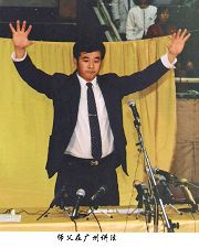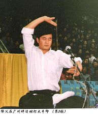 当时参加这次广州法轮功讲法班的学员有五千多人,是师父系统的教授法轮功的学习班中场面最宏大的一次,都是人传人、心传心,大家自觉自愿去的。我是在快开班前一天才决定去的。当时正上大学三年级,克服了很多阻力:请假不准,坐不上车,中途转车又买不上票等。到了之后,入场票已售完(以前参加过班的,票价一半——25元)。晚上开班前,没有入场的学员有近1000人,在场外集体炼功,等候师父的到来。师父一出现,大家非常激动。师父与主办单位协商把学员们排队带进来,但主办单位以盈利为目地不同意。师父在开始讲课前,来到入口处,看望在外面等候排队入场的学员们,足足有五分钟,面带微笑,慈悲祥和的看着大家。我们都激动的鼓起了掌。